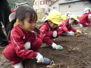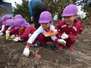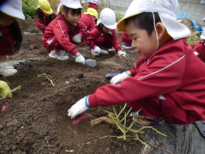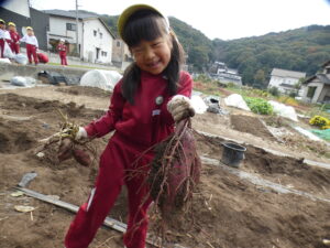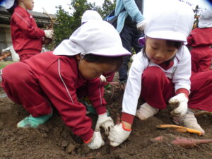 「がんばって掘るぞ!」と張り切っていたものの土が固くてなかなか掘ることができず、引っ張っても出てこなくて「手伝って」とお友だちや保育士と協力しながら掘っていました。土の固さや感触、おいもが出てきた時の喜びは、体験でしか得られない物だと思います。
