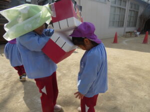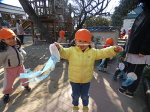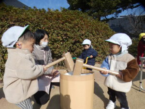 とんどまつり後も、ししまいごっこ、羽根つき、たこあげ、もちつきごっこなど様々なお正月遊びを楽しみました。気に入ったあそびを毎日のように何度も楽しむ姿が印象的でした。