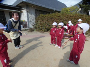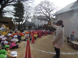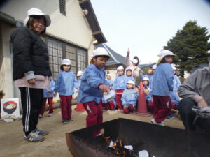 お飾りを燃やした火を囲んでお正月あそびの紹介を聞いたり、ダンスをしたり、十二支のペープサート劇を見たりしました。「書初めや絵を燃やして“もっと上手になりますように”ってお願いするんだよ」とお話を聞きました。煙が空高くあがる様子を見て歓声を上げていました。ししまいが出てきてビックリした子どももいればじっと見つめたり「頭かんで~」と言っている子どももいました。