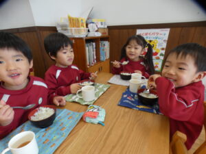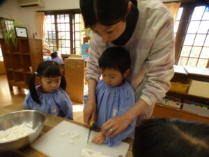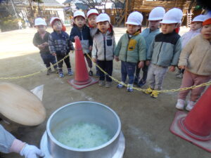 4,5歳児クラスの子どもたちは、大根やかぶを包丁で切る体験をしました。「お家でもしたことあるよ」という子どももいれば「初めて」という子どももいましたが“指を切らないように”と真剣に慎重に切っていました。園庭にかまどを出して炊いていると「おかゆ作っているんでしょ」と小さいクラスの子どもたちも興味を持って見に来ていました。「七草がゆを食べるとお腹の中がきれいになるよ」「一年間、元気にあそべるよ」と教えてもらい、出来立てのおかゆを給食時間に食べました。七草の名前を覚えて言ったり「これ、○○が切った大根!」と言ったりしながら楽しく食べることが出来ました。