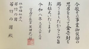優良民間社会福祉事業施設に対する御下賜金を拝受いたしました